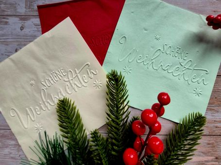 edle Servietten, handgeprägte Karten, feine Kerzen und kleine Schmuckstücke,